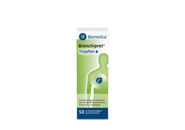 Bronchipret®Tropfen Zur Besserung der Beschwerden bei akuten entzündlichen Bronchialerkrankungen und akuten Entzündungen der Atemwege mit der Begleiterscheinung „Husten mit zähflüssigem Schleim“. Bronchipret Tropfen enthalten 24% (V/V) Alkohol.