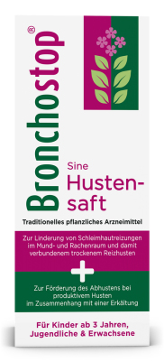 Bronchostop® Sine Hustensaft ist ein traditionelles pflanzliches Arzneimittel angewendet zur Linderung von Schleimhautreizungen im Mund- und Rachenraum und damit verbundenem trockenem Reizhusten sowie zur Förderung des Abhustens bei produktivem Husten im Zusammenhang mit einer Erkältung. Das Arzneimittel ist ein traditionelles Arzneimittel, das ausschließlich auf Grund langjähriger Anwendung für das Anwendungsgebiet registriert ist.