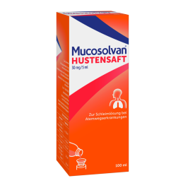 Mucosolvan® Hustensaft 30 mg/5 ml. Wirkstoff: Ambroxolhydrochlorid. Anwendungsgebiet: Zur Schleim lösenden Behandlung bei akuten und chronischen Erkrankungen der Bronchien und der Lunge mit zähem