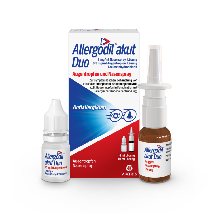 Allergodil akut Duo. Augentropfen: 0,5 mg / ml Augentropfen, Lösung und Nasenspray: 1 mg / ml Nasenspray, Lösung